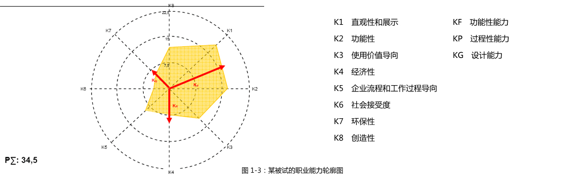 每位被試者可得到一個能力總分和自己所處的能力級別,又可以得到一份描述其職業(yè)能力特點的輪廓圖。輪廓圖展示了三個能力級別和八項能力指標,顯示了能力模型的多維特征。使被試者清楚地了解自己的優(yōu)點和缺陷,從而明確未來的努力方向。