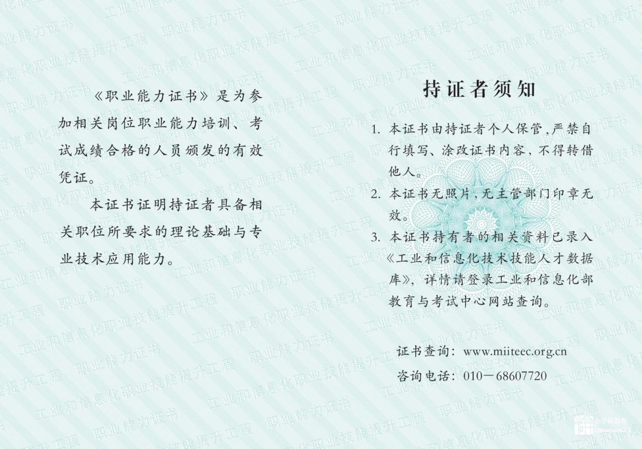 本證書持有者的相關(guān)資料已錄入《工業(yè)和信息化技術(shù)技能人才數(shù)據(jù)庫》,詳情請登錄工業(yè)和信息化部教育與考試中心網(wǎng)站查詢,