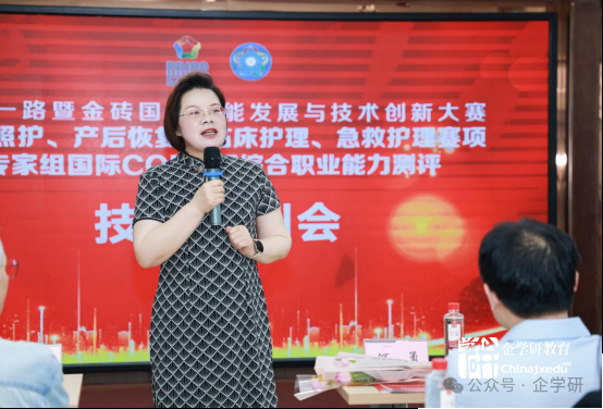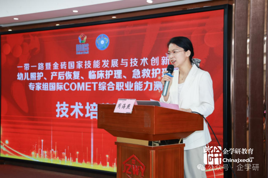 21日上午,金職偉業董事長彭英代表金職偉業集團作開班致辭,金磚國家技能發展與技術創新大賽組委會執委會副主席,北京企學研教育科技研究院執行院長何勇介紹金磚大賽引入COMET綜合職業能力測評的目的與成果實踐,原國家衛生健康委能力建設與繼教中心學術部主任劉晨教授講解COMET綜合職業能力測評體系及其與競賽的框架建構。